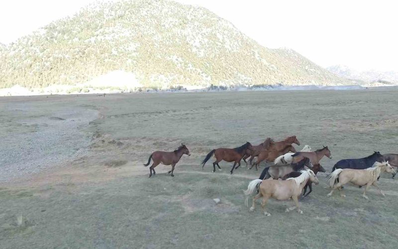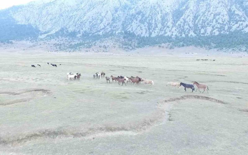 Toroslar’ın, Akdeniz ile İç Anadolu’yu bıçak gibi kestiği bölgede yer alan ve belgesellere konu olan Eynif Ovası’nda yavruları ile doğaya ayrı bir güzellik katan atları izlemek üzere her yıl dünyanın dört bir yanından ziyaretçiler geliyor. Yılkı atları ise ovada yaklaşık 50 sürü halinde yaşıyor. Gruplar halinde yavruları ile aile halinde yaşayan rengarenk yılkı atlarının vahşi yaşamları dron ile görüntülendi.