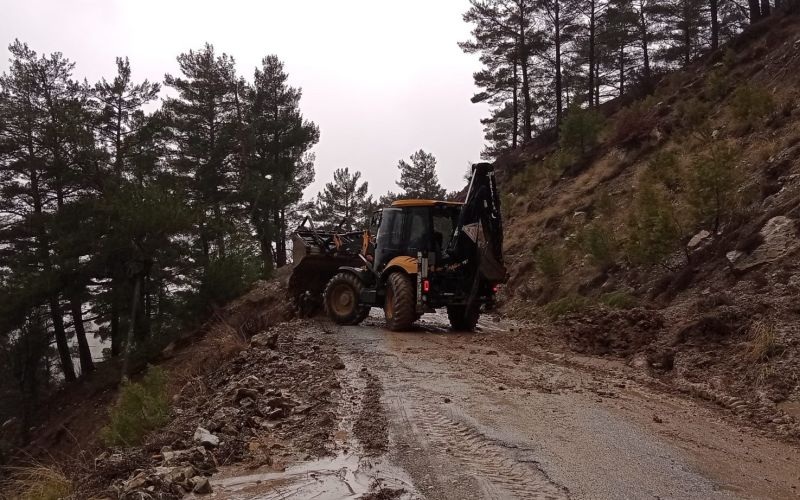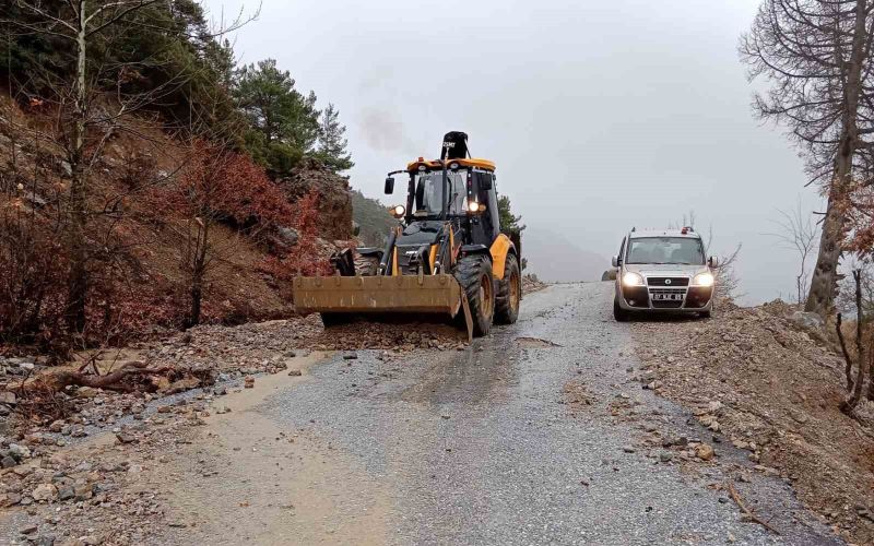 Antalya Büyükşehir Belediyesi ekipleri, olumsuz hava şartlarının etkisini sürdürdüğü Alanya kırsalında yolları açık tutmak için çalışıyor.
