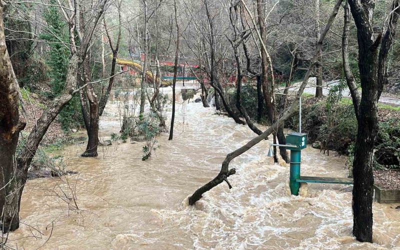 Alanya’nın Oba Mahallesi Alacami çevresinde dün akşam etkili olan sağanak yağışın ardından Oba Çayı taştı. Kısa sürede debisi yükselen çayın taşmasıyla birlikte dere yatağına yakın iki işletmeye ait çardaklar sular altında kaldı. İşletmelerde hasar meydana gelirken, yaşanan su baskını dron ile görüntülendi.