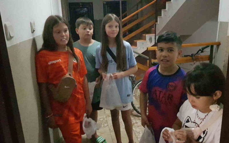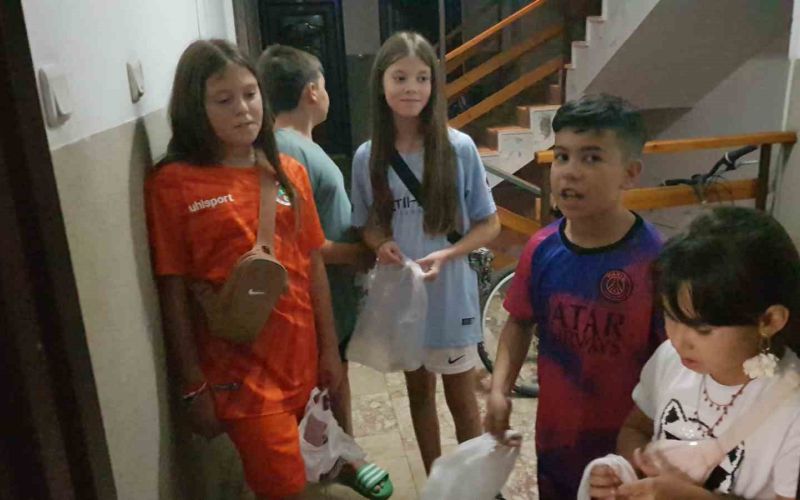 Alanya’ya tatile gelen turist çocuklar Türk çocuklarla birlikte şeker topladı