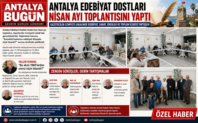 Antalya’da edebiyat ve düşünce dünyasının önemli buluşmalarından biri daha gerçekleşti. Antalya Edebiyat Dostları Grubu’nun nisan ayı toplantısı, Gazeteciler Cemiyeti Lokali’nde yoğun katılımla düzenlendi.