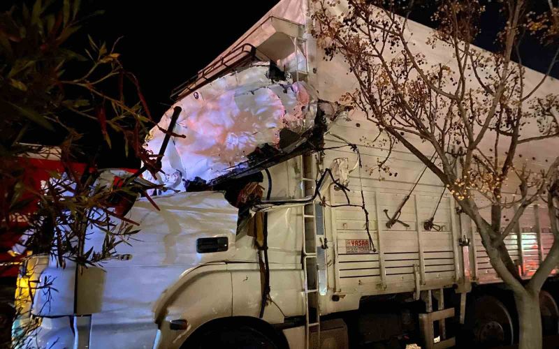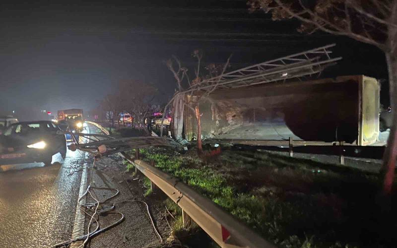 Antalya’nın Serik ilçesinde dorsesi EDS sisteminin bulunduğu direğe çarpan tır devrildi. Kopan demirler, kamyonun kupasına ve otomobile çarptı. Kazada 1’i ağır 2 kişi yaralandı.