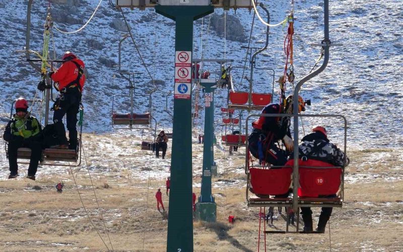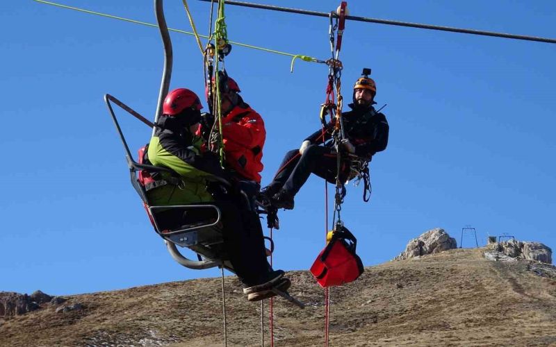 Antalya’da Saklıkent Kayak Merkezi’nde Jandarma Arama Kurtarma (JAK) ve STK’lara ait kurtarma birimlerinin katılımı ile muhtemel bir afet durumunda mahsur kalan vatandaşların kurtarılması senaryosuna dayalı olarak ‘Teleferik Kurtarma Tatbikatı’ yapıldı.