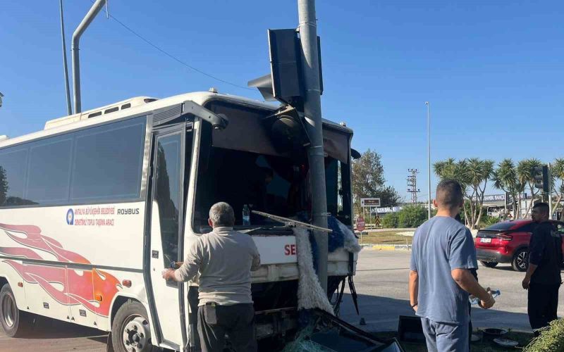 Kaza, Antalya-Alanya D400 kara yolu üzerindeki Dikmen Kavşağı’nda meydana geldi. Edinilen bilgiye göre, Hüsnü T. yönetimindeki 07 YDM 09 plakalı şehir içi yolcu midibüsü ile sürücüsü henüz öğrenilemeyen 33 AAY 224 plakalı otomobil çarpıştı. Çarpışmanın etkisiyle kontrolden çıkan midibüs, trafik ışığı direğine çarparak durabildi. Kazada midibüste bulunan yolculardan Derya A. (40), Nurcan G. (26), Tazagül K. (24) ve Şahadet T. (19) yaralandı. Çevredeki vatandaşların ihbarı üzerine olay yerine sağlık ve polis ekipleri sevk edildi. Yaralılar, sağlık ekiplerince yapılan ilk müdahalenin ardından ambulanslarla Serik’teki hastanelere götürüldü.