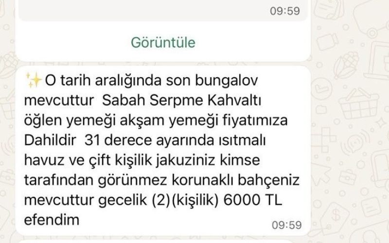 Olay, Antalya’da yaşayan genç bir kadının arkadaşına doğum günü sürprizi yapmak istemesiyle başladı. Hafta sonunu arkadaşıyla birlikte geçirmek isteyen kadın, sosyal medyada gördüğü bungalov ilanı üzerinden iletişime geçti. Hesap yöneticisi tarafından WhatsApp’a yönlendirilen mağdura, tesise ait olduğu belirtilen profesyonel görseller ve konaklama detayları gönderildi.