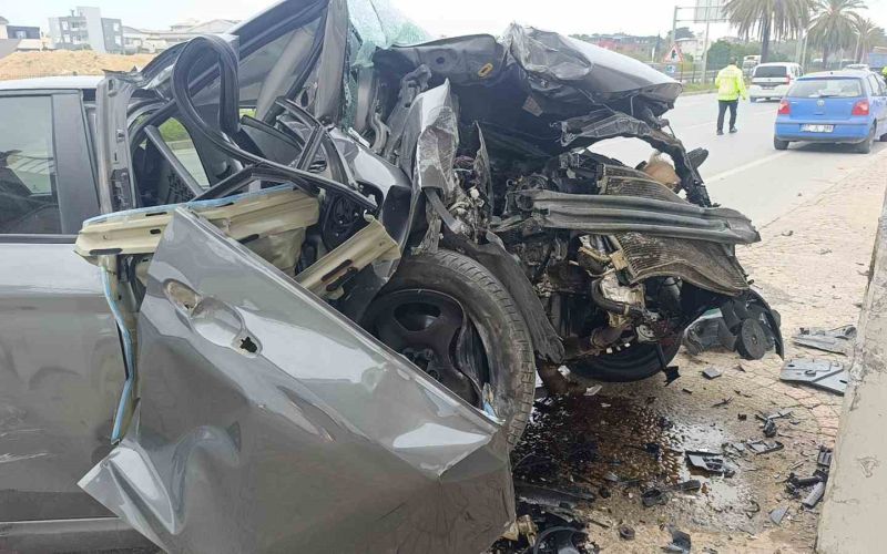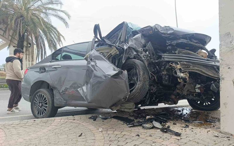 Antalya’nın Manavgat ilçesinde yan yoldan gelen araçla çarpışan araç, üst geçidin ayaklarına çarptı.