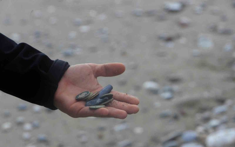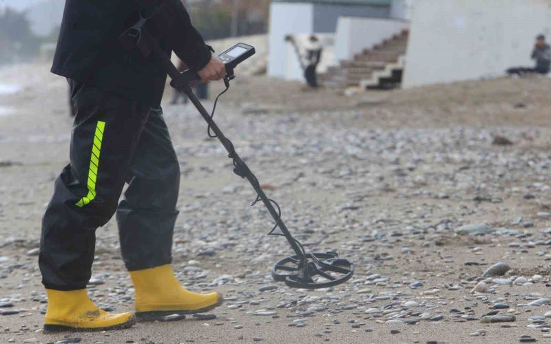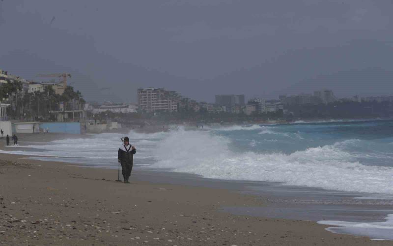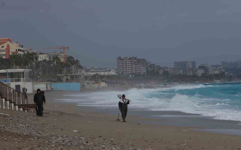 Antalya’da saatteki hızı 50 kilometreyi bulan rüzgar hayatı olumsuz etkilerken define avcıları sahile inerek değerli eşya ve madeni para aradı.