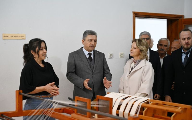 Törenin ardından Vali Hulusi Şahin ve eşi Ebru Şahin, İbradı’nın köklü kültürünü yaşatan bez ayağı dokuma, geleneksel el dokuması ve çarpana dokuma gibi birçok dokuma türünün öğretildiği Halk Eğitim Merkezi Yöresel Bez Dokuma Kursunu ziyaret etti. Ziyarette, kurs kapsamında yürütülen çalışmalar ve üretilen yöresel ürünler hakkında bilgi aldı.