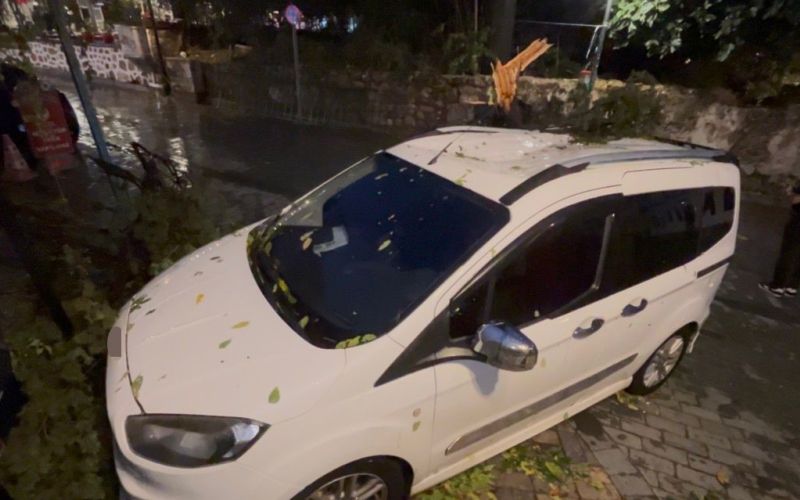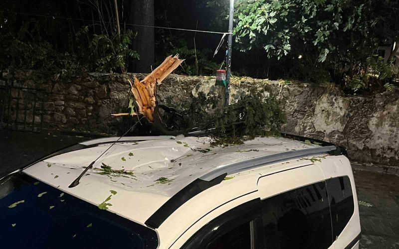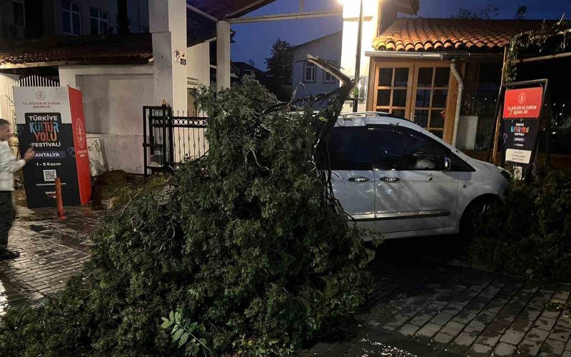 Antalya’da etkili olan fırtınanın etkisiyle kırılan ağaç park halindeki aracın üzerine devrildi.