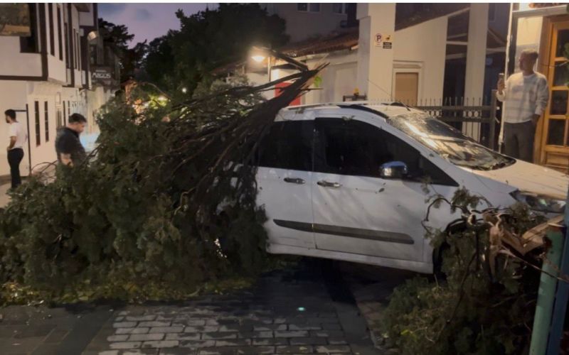 Olay, Muratpaşa ilçesi Tuzcular Mahallesi Balıkpazarı Sokak’ta meydana geldi. Akşam saatlerinde dolu karışımlı şiddetli yağış ve fırtınanın etkisiyle sokakta bulunan bir çam ağacı kökünden kırılarak, park halindeki hafif ticari aracın üzerine düştü.