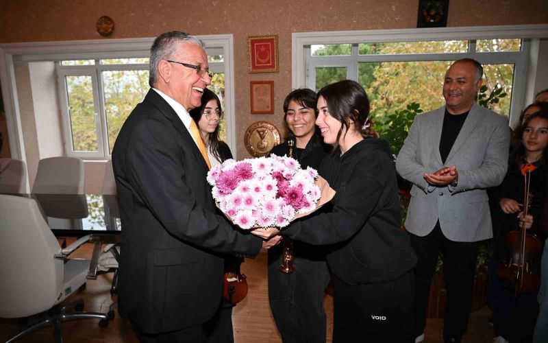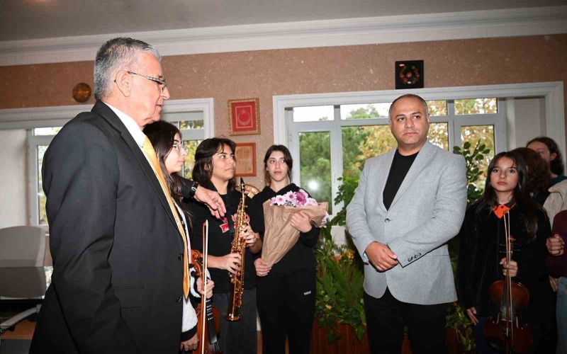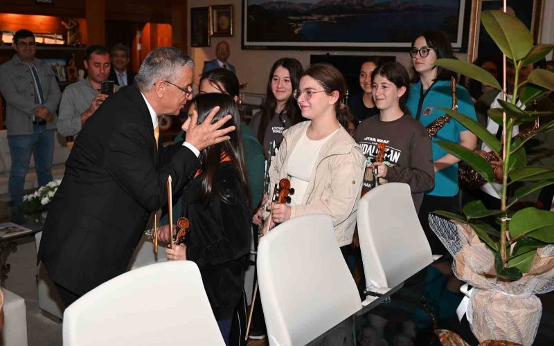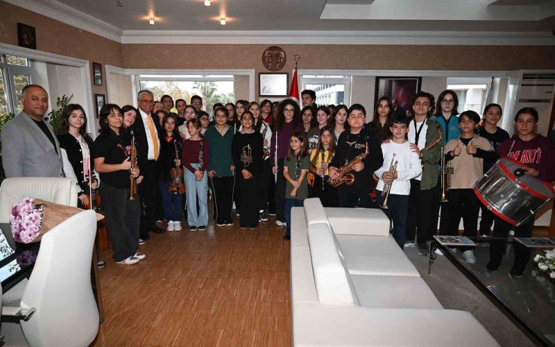 Kemer Belediyesi ATSO Eğitim ve Sanat Merkezi’nde ücretsiz müzik eğitimi alan Kemer Belediyesi Gençlik Orkestrası öğrencileri, Orkestra Şefi Furkan Üstündağ ile Öğretmenler Günü dolayısıyla Kemer Belediye Başkanı Necati Topaloğlu’nu ziyaret ederek gününü kutladı.