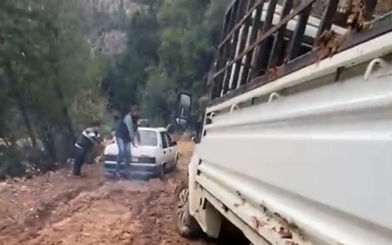 Antalya’nın Serik ilçesinde heyelan nedeniyle yola dökülen toprak zemin, yağışla birlikte çamurla kaplanınca yoldan geçen araç sürücüleri zor anlar yaşadı.