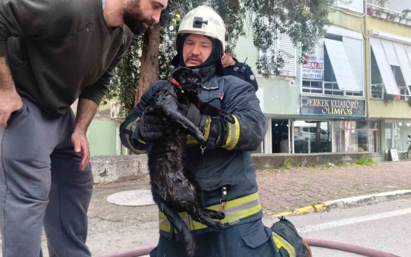 Antalya’da bir dairede çıkan yangında içerideki kadın polis ekipleri tarafından kurtarılırken, itfaiye ekipleri dumandan etkilenen kediyi kalp masajı ile hayata döndürdü.