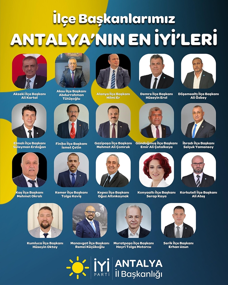 İlçe Kongrelerini büyük bir coşku ve demokrasi şöleniyle tamamlayan İYİ Parti’de İlçe Başkanları şu isimlerden oluştu: