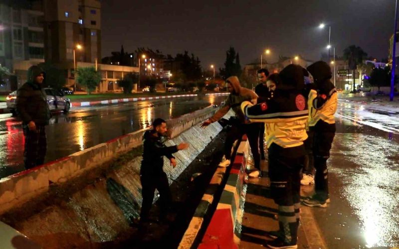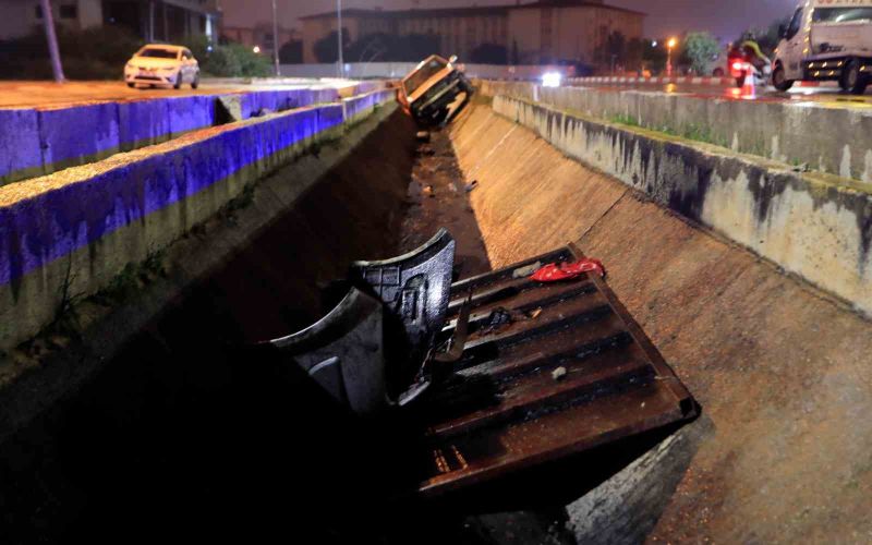 Antalya’da kayganlaşan yolda kontrolden çıkarak yağmur suyu tahliye kanalına uçan otomobilin sürücüsü kazayı yara almadan atlattı.
