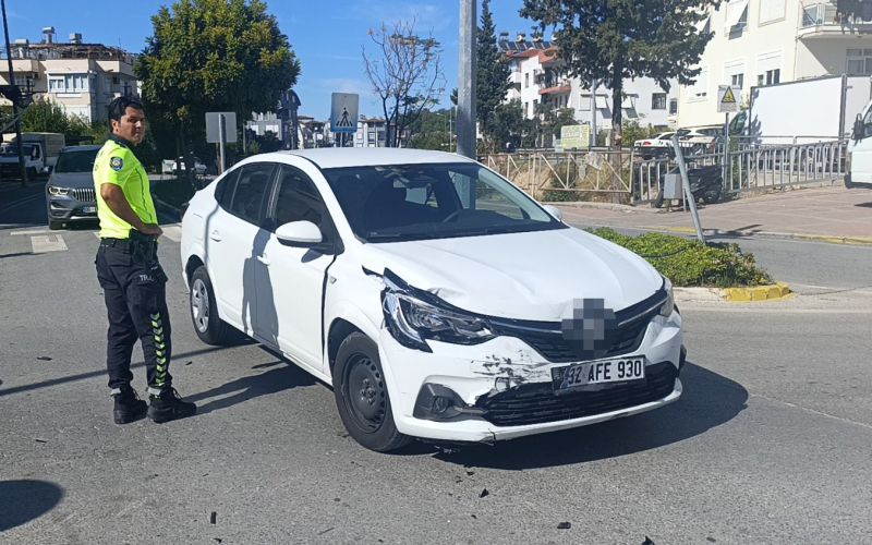 Kaza, Manavgat ilçesi Yukarı Pazarcı Mahallesi Mehmet Akif Ersoy Caddesi üzerinde meydana geldi. Edinilen bilgiye göre, 4082 sokaktan gelip 4081 sokak istikametine gitmekte olan Ferhat Y.’nin kullandığı 32 AFE 930 plakalı otomobil,  Mehmet Akif Ersoy Caddesinde seyir halindeki Haydar T.’nin kullandığı 07 AHA 453 plakalı otomobile yandan çarptı. Kazayı görenlerin 112 Acil Çağrı Merkezi’ne ihbarı ile olay yerine polis ve sağlık ekipleri sevk edildi. Kazada 07 AHA 453 plakalı otomobilde yolcu olarak bulunan Meryem T. yaralanırken, sağlık ekibinin olay yerindeki müdahalesinin ardından ambulansla hastaneye kaldırıldı.