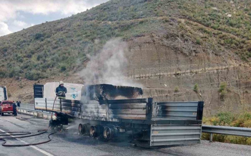 Konya-Antalya D-687 karayolunda mermer yüklü tırın dorsesi, çıkan yangında kullanılamaz hale geldi.