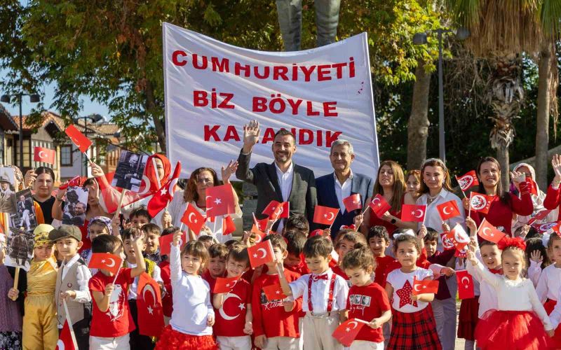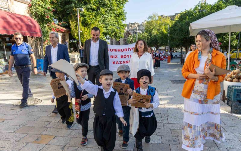 Manavgat Belediyesi Side Kreş ve Gündüz Bakımevi öğrencileri, 29 Ekim Cumhuriyet Bayramı etkinliği kapsamında hazırladıkları "Cumhuriyet ilan edildi" manşetli sembolik gazeteleriyle Antik Side sokaklarında vatandaşlara Cumhuriyet coşkusunu yaşattı.