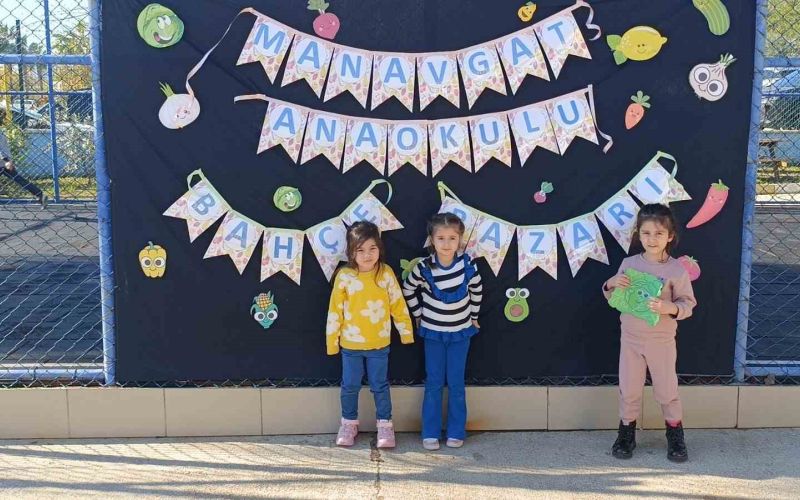 Manavgat Anaokulu Bahçesi; kurulan tezgahlar, tezgahlardaki sebze-meyveler ve ellerinde ürünlerin fiyatının yazılı olduğu etiketlerle satış yapmaya çalışan minik öğrencilerle tam anlamıyla bir semt pazarına dönüştü.