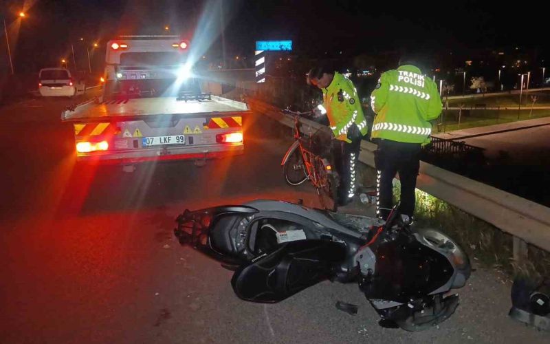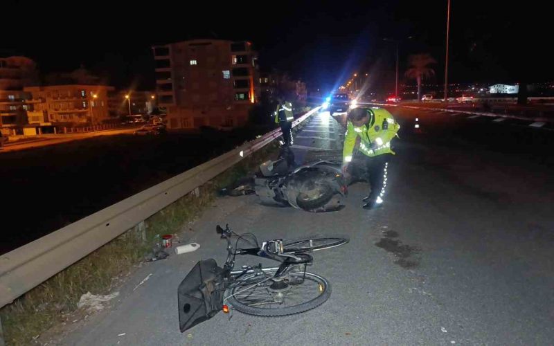 Manavgat ilçesi Alanya-Antalya D-400 Karayolunda meydana gelen kazada, Antalya istikametine seyir halindeki Muhammed O.’ın kullandığı 07 BZL 056 plakalı motosiklet, Manavgat Çevreyolu Köprüsüne yaklaştığı sırada aynı istikamette gitmekte olan Hasan S.’nin kullandığı bisikletle çapıştı. Motosiklet ve bisikletin yaklaşık 30 metre sürüklendiği kazada sürücüler yaralandı. Kazayı gören diğer sürücülerin 112 Acil Çağrı Merkezi’ne ihbarı ile olay yerine polis ve sağlık ekipleri sevk edildi. Yaralılar 112 sağlık ekiplerinin olay yerindeki ilk müdahalesinin ardından ambulansla hastaneye kaldırılırken, motosiklet sürücüsü Muhammed O. ve bisiklet sürücüsü Hasan S.’nin hayati tehlikesinin bulunduğu öğrenildi.