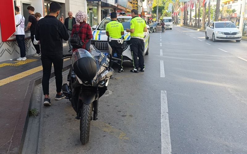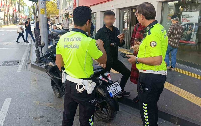 Manavgat ilçesi Antalya Caddesi’nde devriye görevi ifa eden Manavgat İlçe Emniyet Müdürlüğü Trafik Denetleme Büro Amirliği ekipleri, seyir halindeki plakası okunamayacak şekilde bandana ile kapatılmış motosikleti durdurdu. Trafik ekiplerinin yaptığı kontrolde motosikleti kullanan Erdem C.’nin sürücü belgesinin olmadığı, kaskı yanında olmasına rağmen takmadığı ve aynaları kapattığı belirlendi. Motosiklet sürücüsü ve motosiklet sahibine toplam 43 bin 149 TL para cezası uygulandı.