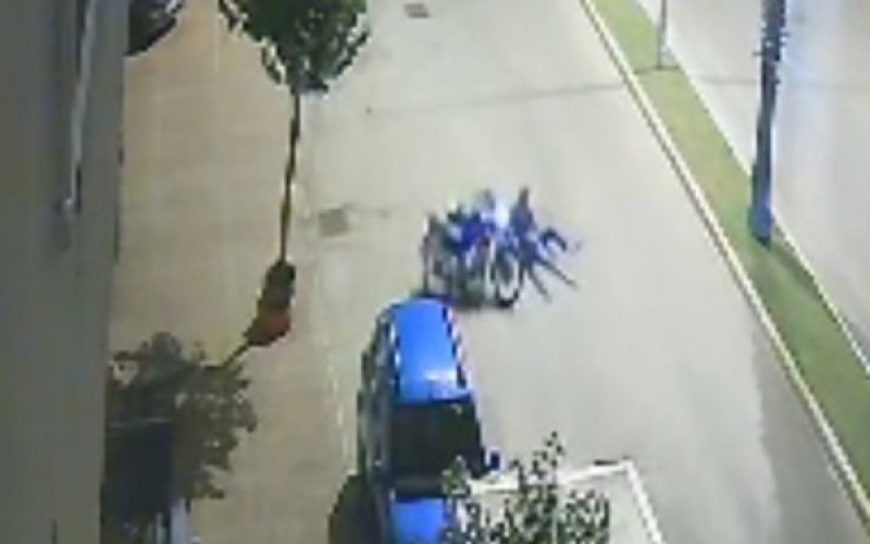 Virajı alamayıp devrilen motosiklet, park halindeki otomobile çarptı. Kazada yaralandığı tahmin edilen sürücü olay yerinden motosikletine binerek uzaklaştı. Otomobil sahibi durumu polise bildirdi. Motosikletin park halindeki araca çarpma anı güvenlik kamerasına yansıdı.