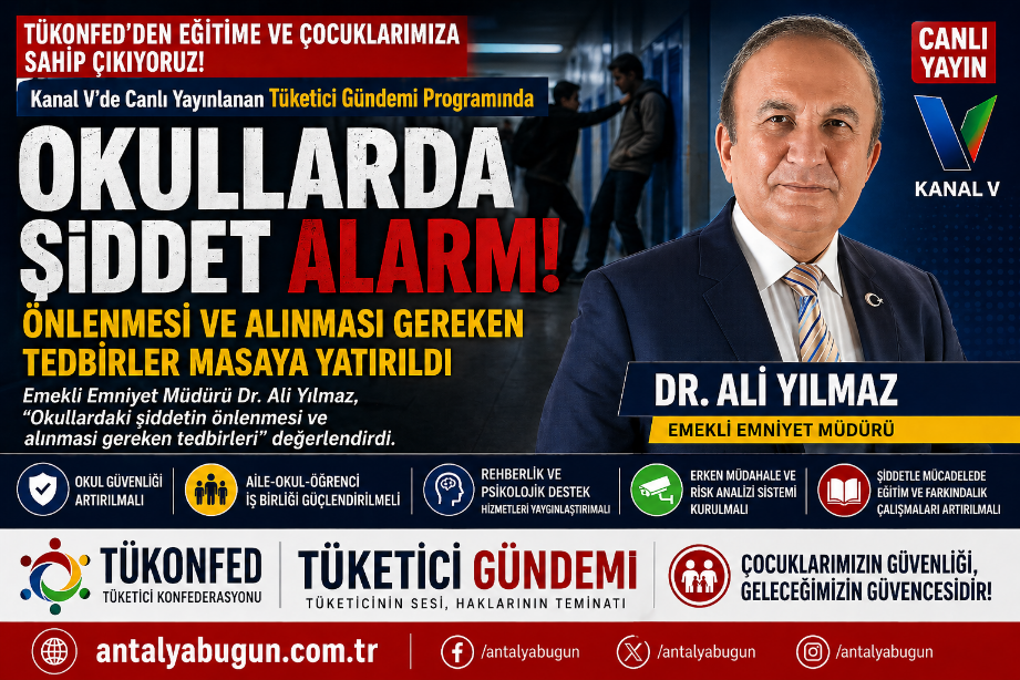 TÜKONFED tarafından hazırlanan ve Kanal V’de yayınlanan Tüketici Gündemi programında konuşan Emekli Emniyet Müdürü Dr. Ali Yılmaz, okullarda artan şiddet olaylarını tüm boyutlarıyla değerlendirdi. Yılmaz, “Sorun sadece güvenlik değil, toplumsal bir kırılmadır” diyerek dikkat çekti. TÜKONFED tarafından hazırlanan ve Kanal V ekranlarında canlı yayınlanan Tüketici Gündemi programında, eğitim kurumlarında son dönemde artan şiddet olayları masaya yatırıldı.