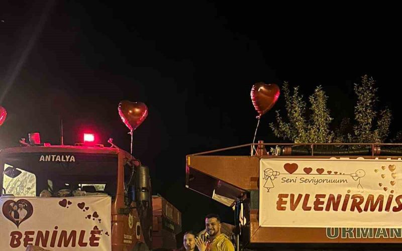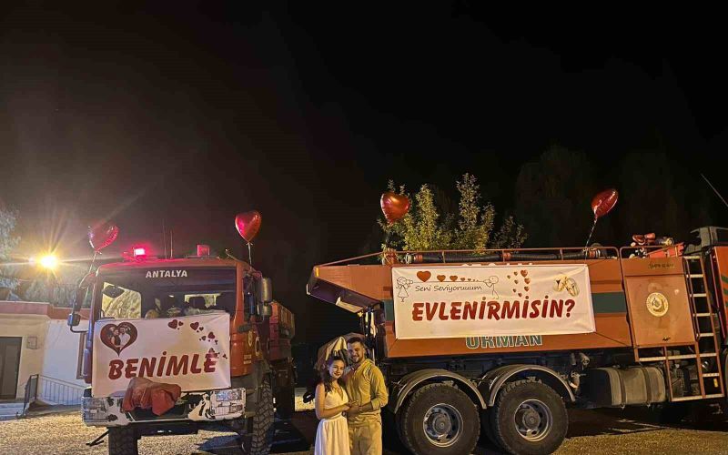 Antalya’nın Serik ilçesinde orman işçisi, görev yaptığı arazöze "Seni seviyorum, benimle evlenir misin?" yazılı pankart asarak kız arkadaşına unutulmaz bir evlilik teklifi yaptı.