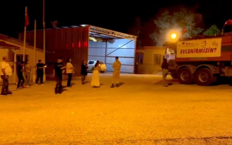 Mesai arkadaşlarının desteğiyle hazırlık yapan Deveci, görev yaptığı arazözün üzerine büyük bir pankart asarak "Seni seviyorum, benimle evlenir misin?" yazdırdı. Kız arkadaşı Aytaç iş yerine geldiğinde, Deveci diz çökerek yüzüğü uzattı ve "Benimle evlenir misin?" dedi.