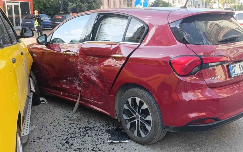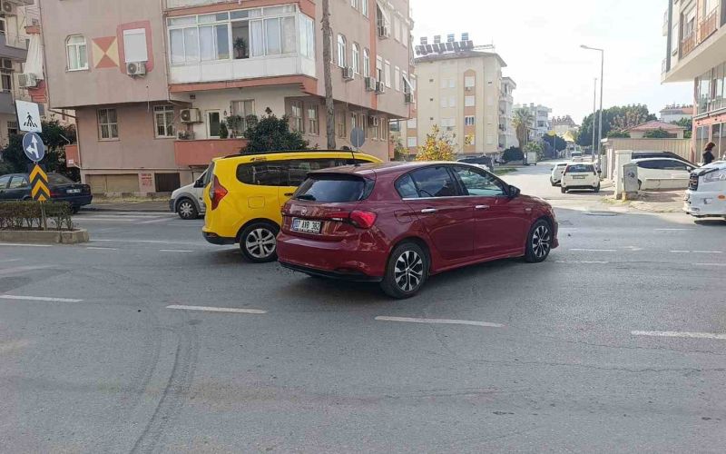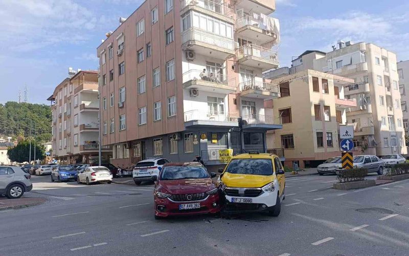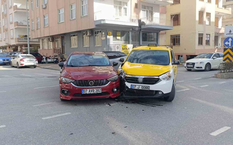 Antalya’nın Manavgat ilçesinde sağa dönmek için sinyal verip önce sol şeride doğru kayan otomobil aynı istikamette seyir halindeki ticari taksi ile çarpıştı.