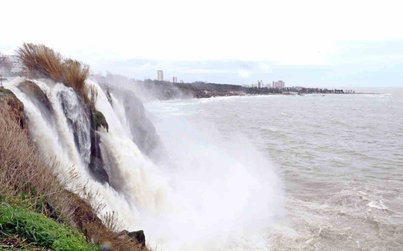 Sarı kod ile uyarılan Antalya’nın dünyaca ünlü şelalesi şiddetli rüzgar nedeniyle döküldüğü alandan tersine çağladı, sağanak nedeniyle de şelaleden akan sular denizin rengini kahverengiye bürüdü. Şelaleyi izlemeye gelen turistler, yağış olmamasına rağmen üzerlerine yağan sudan nasibini aldı.