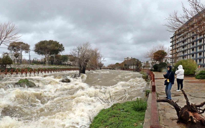 Meteorolojinin sağanak ve fırtına uyarısında bulunduğu Antalya’da dün gece saatlerinde başlayan yağış, sabah saatlerinde de devam etti. Öğle saatlerinde kentte yağış dururken, kapalı bir hava hakim oldu. Son 2 haftadır etkili olan yağışlar nedeniyle, dünyaca ünlü Düden Şelalesi’nin denizle buluştuğu alanda görsel şölen oluştu. Sağanak nedeniyle adeta çamur çağlayan şelale, denizin rengini de kahverengiye bürüdü. Güneyden esen şiddetli rüzgar, şelalenin denizle buluştuğu alanda suyu tersine döndürdü. Yağış olmamasına rağmen şelaleye gelen turistler ise bu sulardan nasibini aldı. Oluşan manzarayı hayranlıkla izleyen turistler, bol bol fotoğraf çekindi.