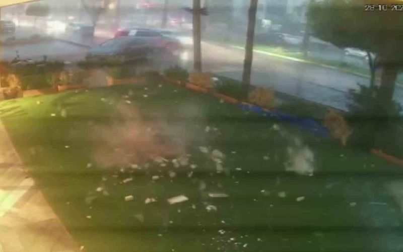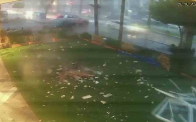 Antalya’da dün akşam saatlerinde yaşanan fırtınaya dayanamayarak yola uçan tonlarca ağırlığındaki çatının düşme anı güvenlik kamerasına yansıdı
