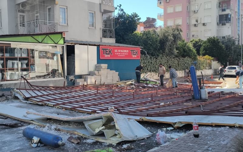 Turizm kenti Antalya’da dün akşam saatlerinde aniden bastıran ve yaklaşık 20 dakika süren şiddetli yağış ve fırtına sırasında birçok noktada hayat olumsuz etkilenmişti. Kentin farklı noktalarında fırtına nedeniyle rüzgarın şiddetine dayanamayan ağaçlar araç ve insanların üzerine devrilmişti. Muratpaşa ilçesi Meydankavağı Mahallesi Perge Bulvarı üzerinde ise bir binanın çatısında bulunan tonlarca ağırlıktaki demir profil ve PVC malzemelerden yapılan yola uçmuştu.