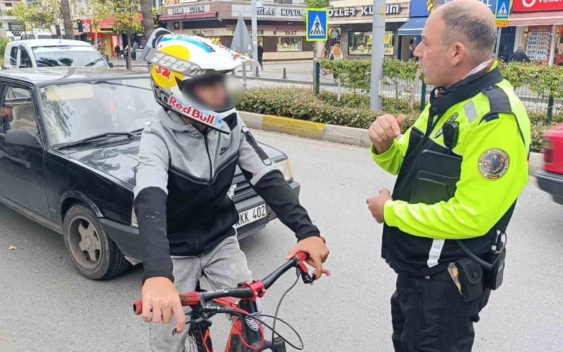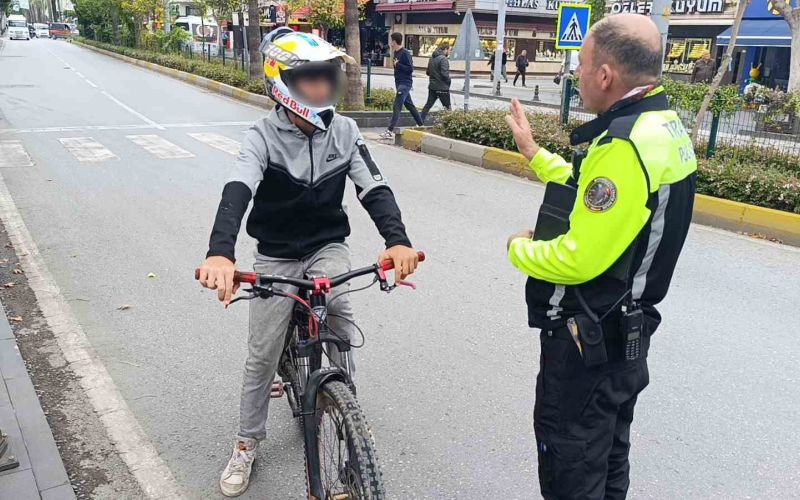 Antalya’nın Manavgat ilçesinde uygulama yapan trafik polisi, diğer bisikletliyle yan yana gelen ve trafiği tehlikeye düşüren bisiklet sürücüsüne yolun en sağından gitmesi, akrobasi hareketleri yapmaması konusunda nasihatte bulundu.