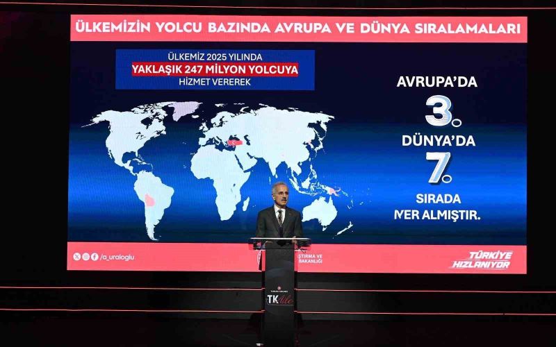 2002’de iç ve dış hatlarda seyahat eden yaklaşık 34.5 milyon olan yolcu sayısını da 2025 yılında transit yolcularla birlikte 247 milyon 163 bine çıkardıklarını kaydeden Bakan Uraloğlu, "Sizlerle birlikte Cumhuriyet tarihinin yeni rekorunu kırdık. Hatırlayacağınız üzere İstanbul Havalimanı’nda üçlü bağımsız pist operasyonu ile Avrupa’da bir ilki de gerçekleştirdik. Bu uygulamayı ABD’nin ardından hayata geçiren tek ülke olarak tarihe geçtik. İstanbul Havalimanımızda aynı anda 3 uçağın iniş ve kalkış yapmasıyla daha verimli ve dinamik kapasite yönetimi ile olası gecikmeleri ortadan kaldırdık" dedi. Bu atılımın uçak trafiğinde yüzde 6, toplam yolcu trafiğinde ise yüzde 5 artış sağlayarak İstanbul Havalimanı’na ne kadar büyük bir doping etkisi yaptığını gördüklerini dile getiren Uraloğlu, "İstanbul Havalimanı’mızda 2025 yılında iç ve dış hatlarda toplam 549 bin 319 uçak trafiği gerçekleşti. İç hatlarda 17 milyon 730 bin, dış hatlarda 66 milyon 727 bin olmak üzere 84 milyon 457 bin yolcuya hizmet sunduk. Bu sayıyla İstanbul Havalimanı, yolcu sayısı bakımından Avrupa’da 2’nci, dünya genelinde ise 7’nci sırada yer aldı" diye konuştu. İstanbul Havalimanı’nın tek başına Türkiye nüfusuna yakın sayıda yolcuyu misafir ettiğine dikkati çeken Bakan Uraloğlu, havalimanının büyük bir başarıya imza attığını kaydetti.